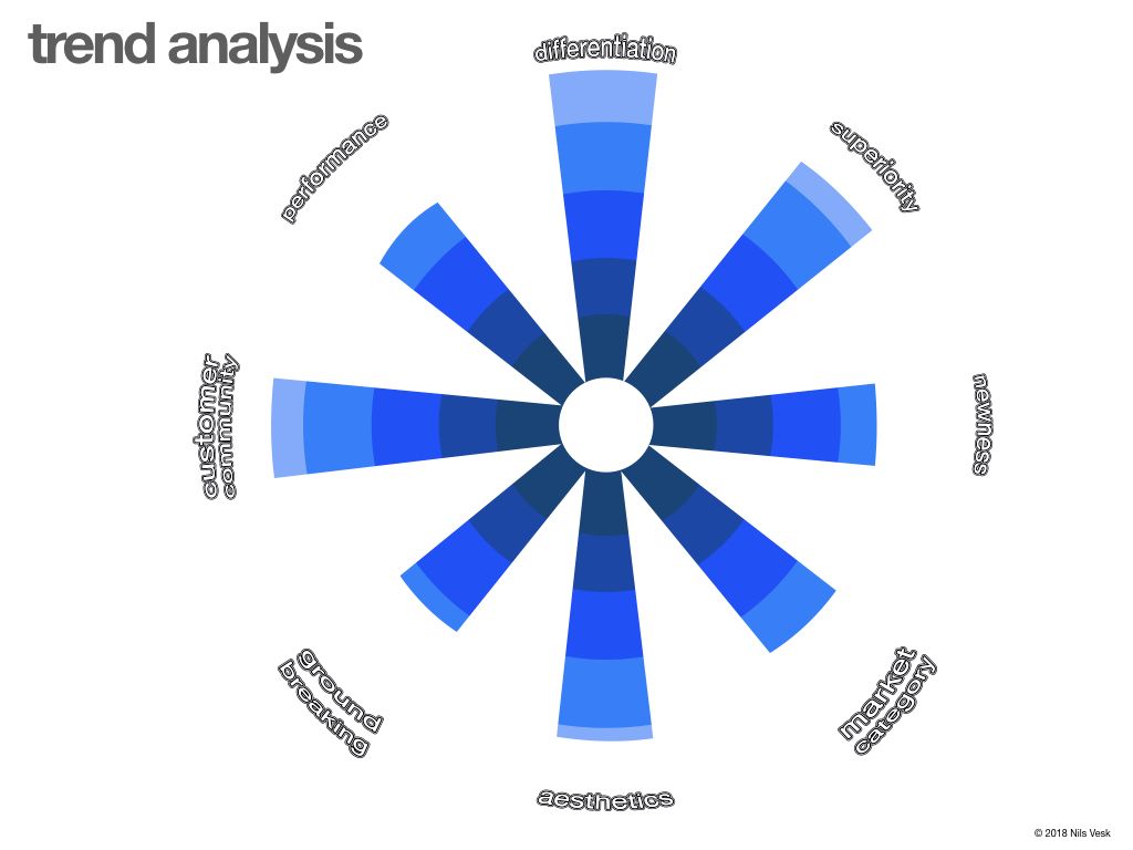 For example, for differentiation on a scale of 0 to 10, how remarkable and unique is the trending product/ service? If it's not even remarkable you might give it a score of 2 and then plot it on the polar bar chart. Repeat the activity for all the other criteria and you have your trend analysis chart.