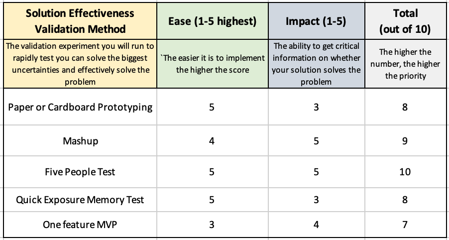 To find which solution validation experiment to use, youâre going to brainstorm and prioritise which solution effectiveness validation technique to use using this solution validation matrix.