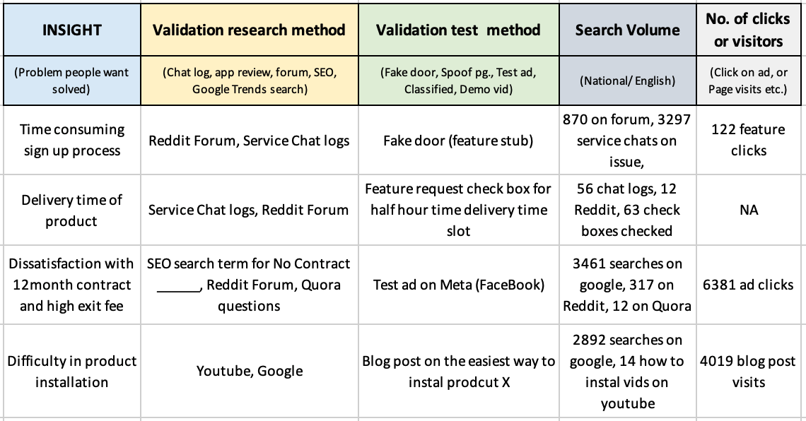 You could take your list of insights (problems you think people want to be solved) and create a simple spreadsheet recording the data you collect, like the one below.