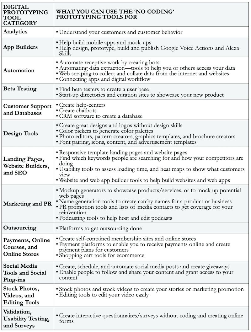 Hereâs the main category of prototype building tools (without coding or tech experience) that I find my clients need: